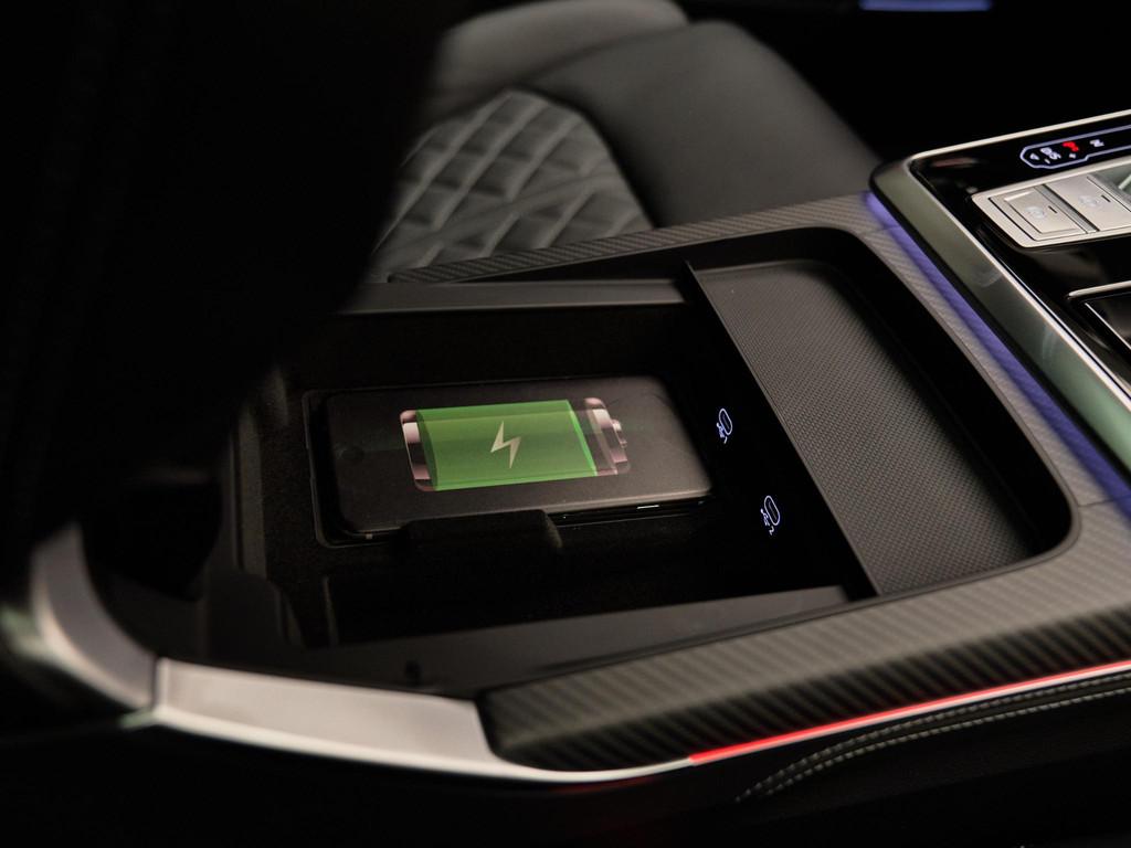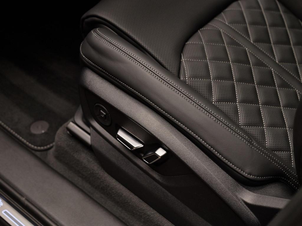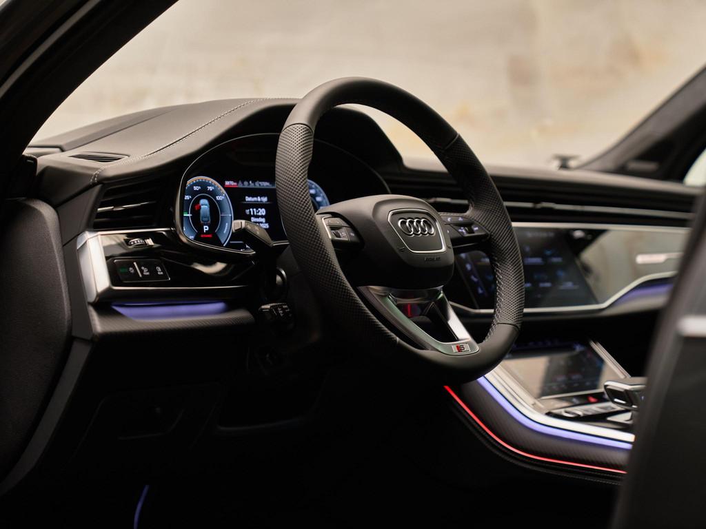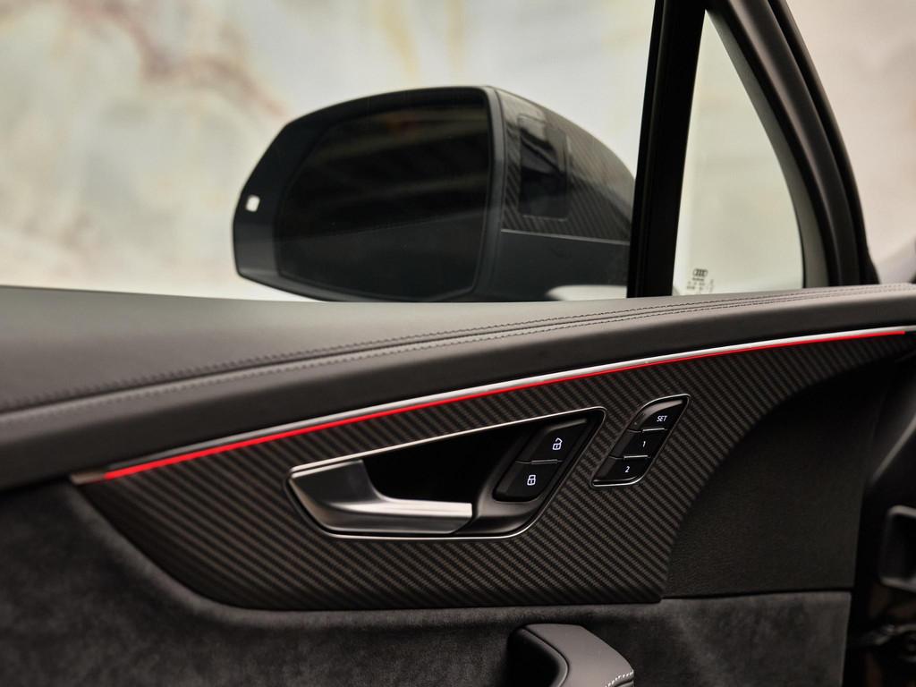 De uitstraling wordt bepaald door Mythoszwart metallic (0E0E), Optiekpakket zwart plus (4ZP) en Stylingpakket carbon (6FM). Binnenin: mat carbon twill decor (5MH), hemel in Dinamica (PL2), Leder Valcona met S-logo’s (N0Q) en Lichtpakket plus met ambient lighting (QQ2). Buitenspiegels 6XL zijn elektrisch inklapbaar, verwarmbaar, aan beide zijden automatisch dimmend en met geheugen. Velgen Audi Sport 22” (C9Y) met 285/35 R22 banden maken het plaatje af.