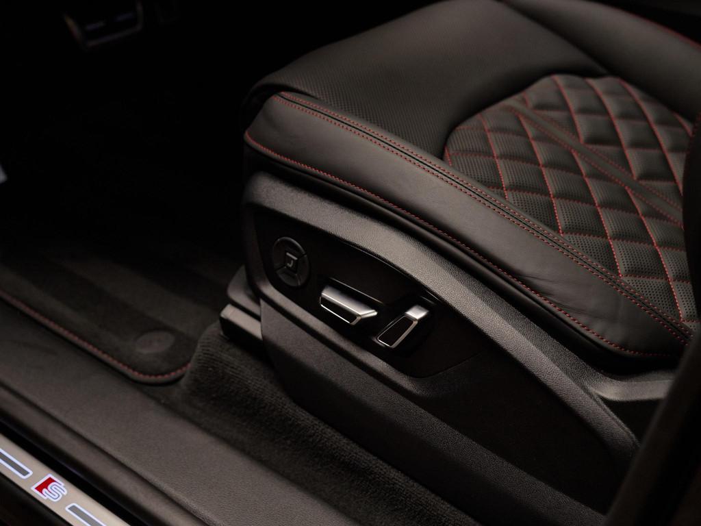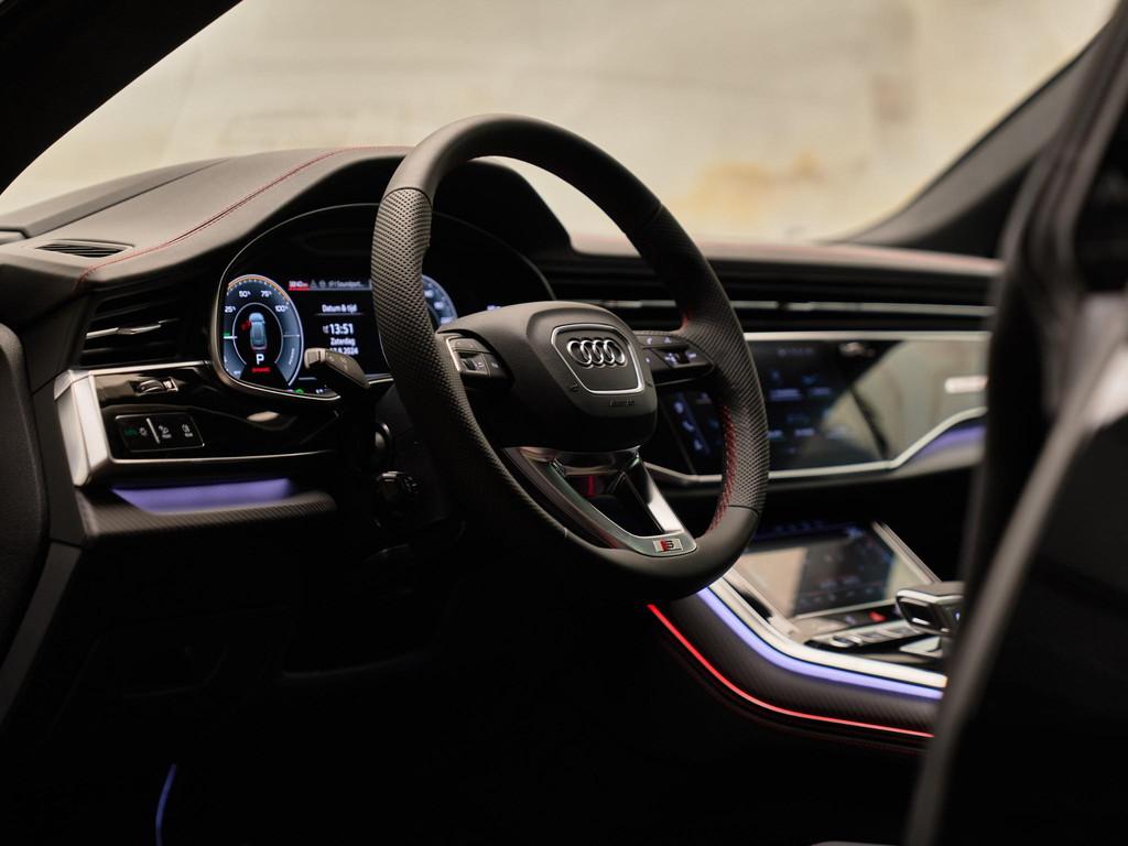 Het exterieur van de Audi Q8 straalt elegantie uit met zijn Daytonagrijs pareleffect lak (6Y6Y) en zwarte buitenspiegelhuizen (6FJ). Binnenin zorgen de hoogwaardige lederen bekleding met S-logo's en ruitpatroon (N0Q) en de decoratieve mat carbon twill inlegstukken (5MH) voor een luxueuze ambiance.