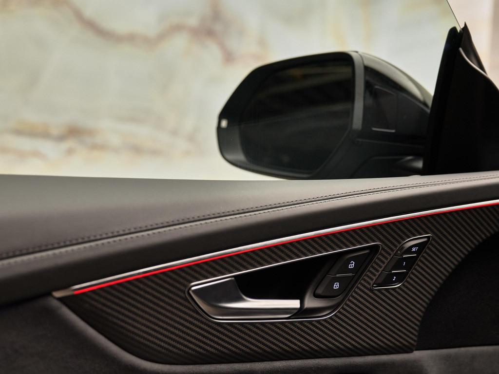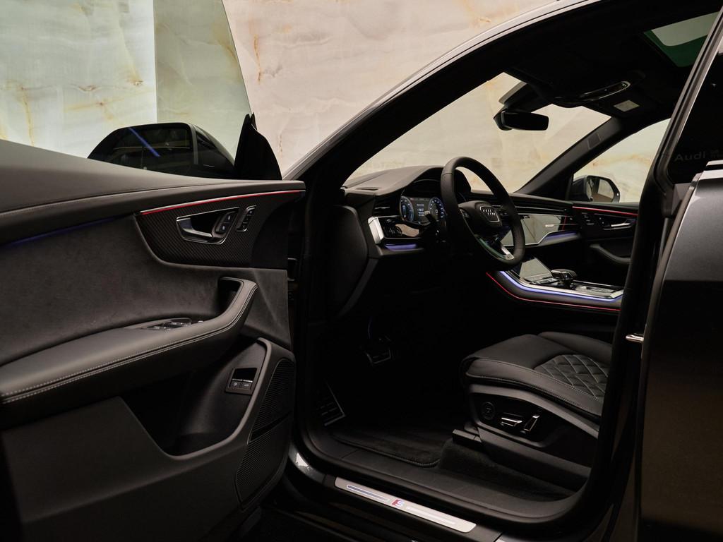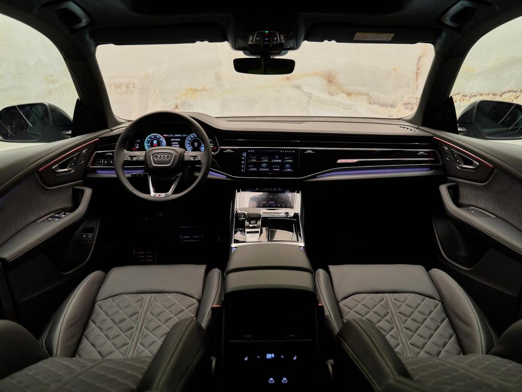 Het exterieur van de Audi Q8 straalt elegantie uit met zijn Daytonagrijs pareleffect lak (6Y6Y) en zwarte buitenspiegelhuizen (6FJ). Binnenin zorgen de hoogwaardige lederen bekleding met S-logo's en ruitpatroon (N0Q) en de decoratieve mat carbon twill inlegstukken (5MH) voor een luxueuze ambiance.