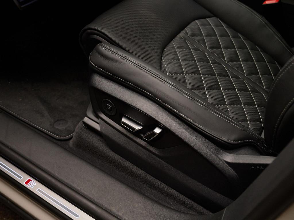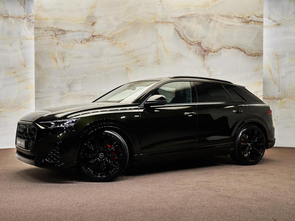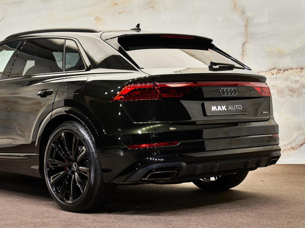 Het exterieur wordt gekenmerkt door de S line-uitvoering (04H), 23 inch Audi Sport lichtmetalen velgen (58U) met 285/35 R23 banden (H7J), zwarte dakreling (3S2), warmtewerend donker getint glas (QL5), digitale OLED-achterlichten (8SC) en HD matrix-ledkoplampen met Audi-laserlicht (PXB). De elektrisch bedienbare achterklep met servosluiting (4E7 / GZ2) verhoogt het gebruiksgemak aanzienlijk.