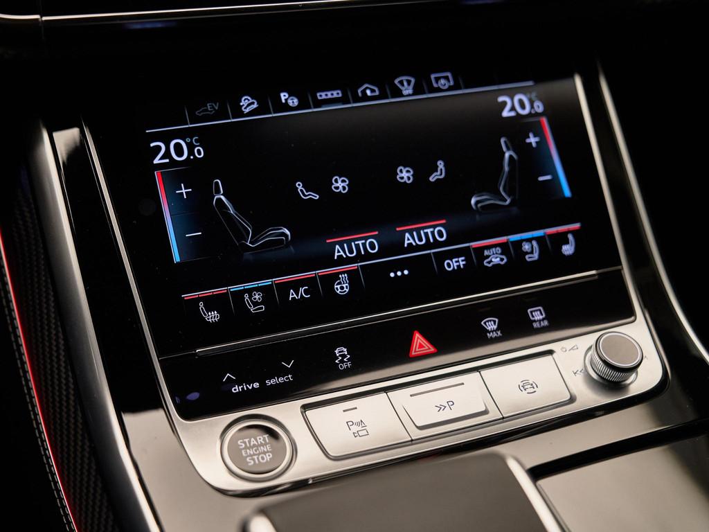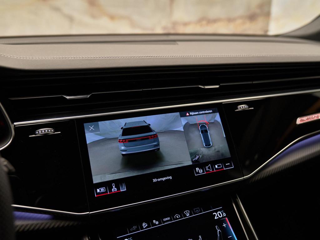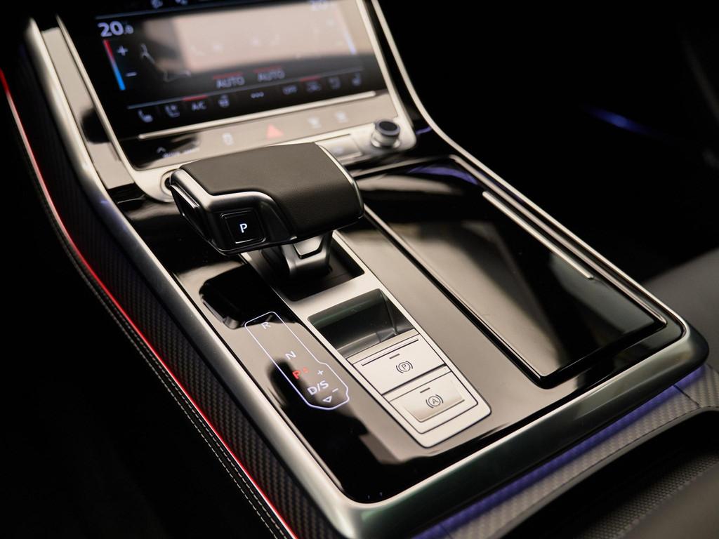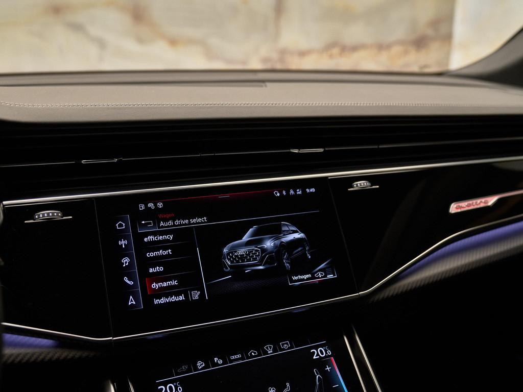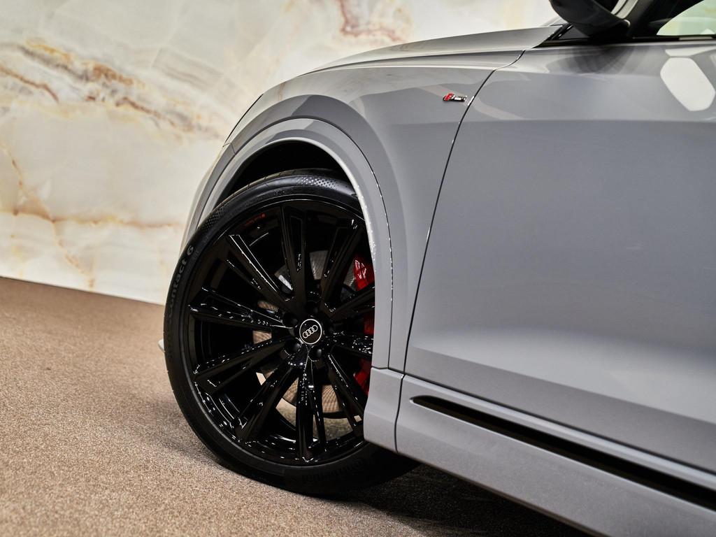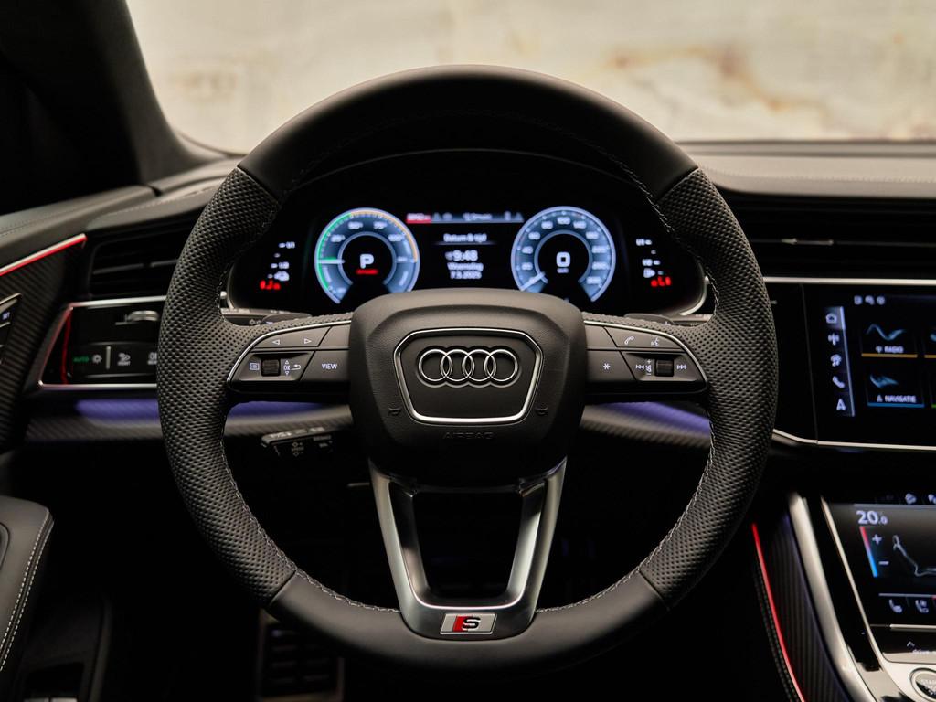 Het exterieur van de Audi Q8 straalt sportiviteit uit met zijn Nardogrijs (Audi Exclusive) (Q0Q0) kleur en zwarte buitenspiegelhuizen (6FJ). Binnenin zorgen de hoogwaardige lederen bekleding met S-logo's en ruitpatroon (N0Q) en de decoratieve mat carbon twill inlegstukken (5MH) voor een luxueuze ambiance.