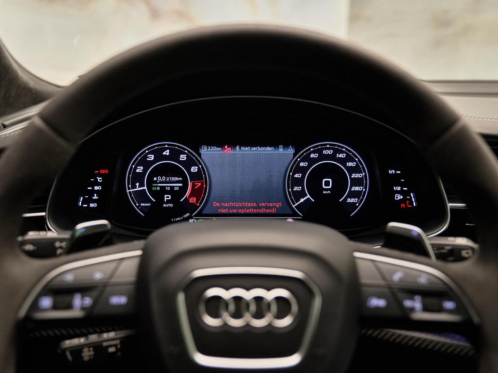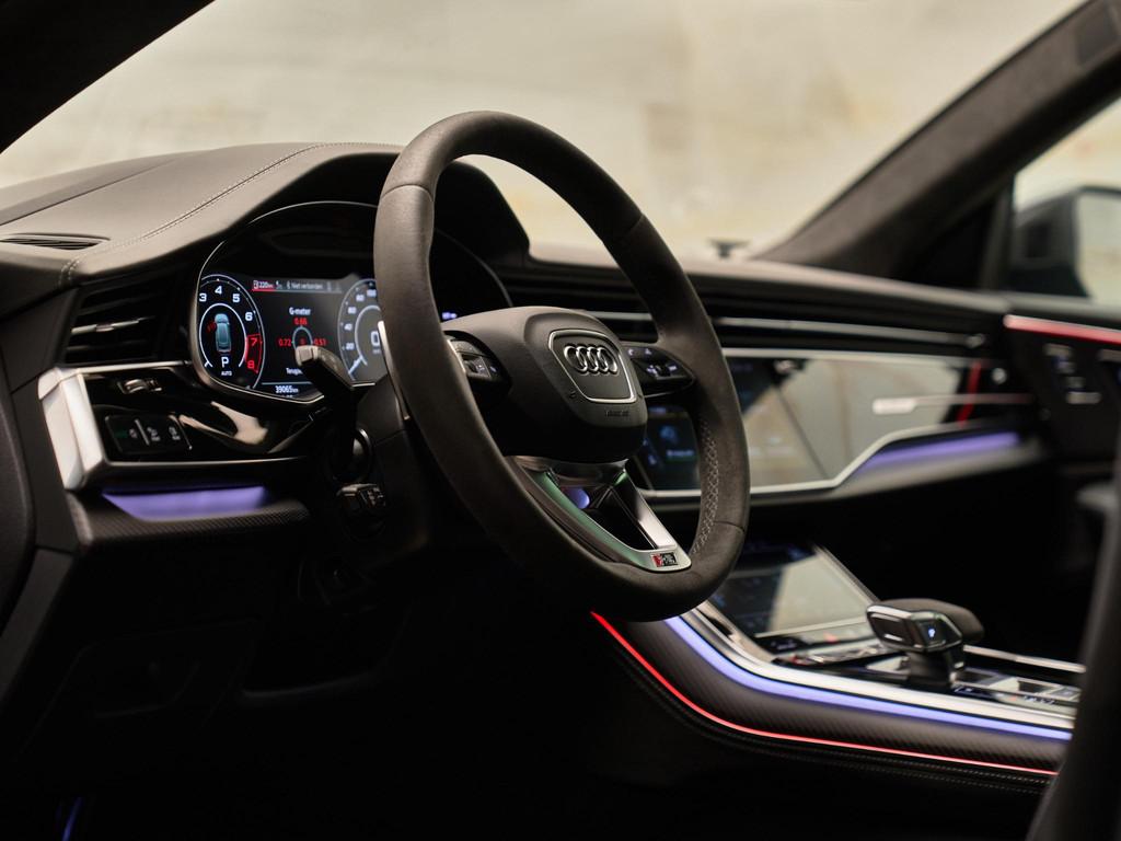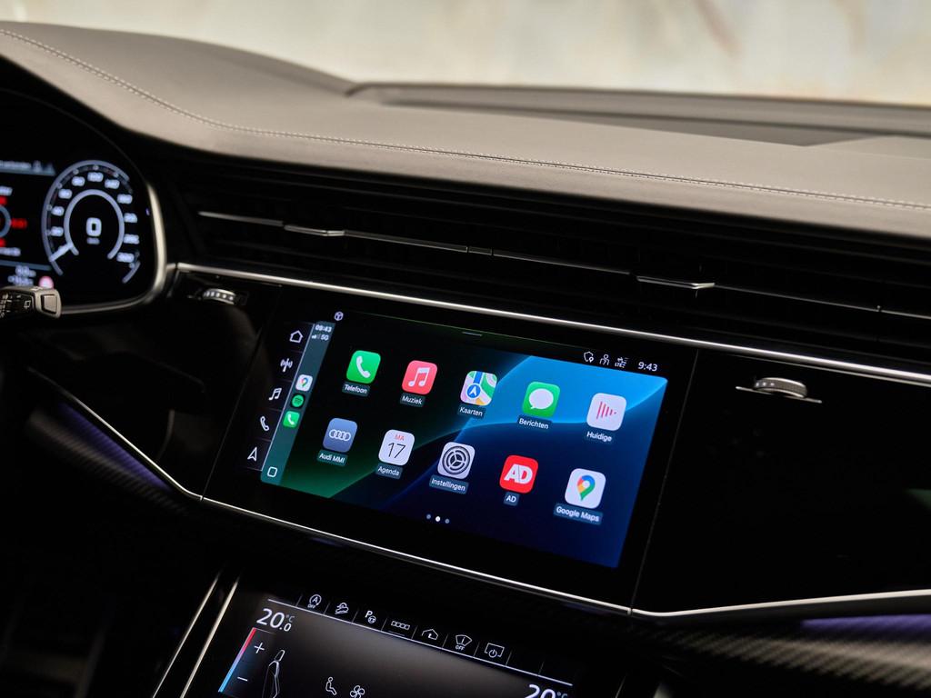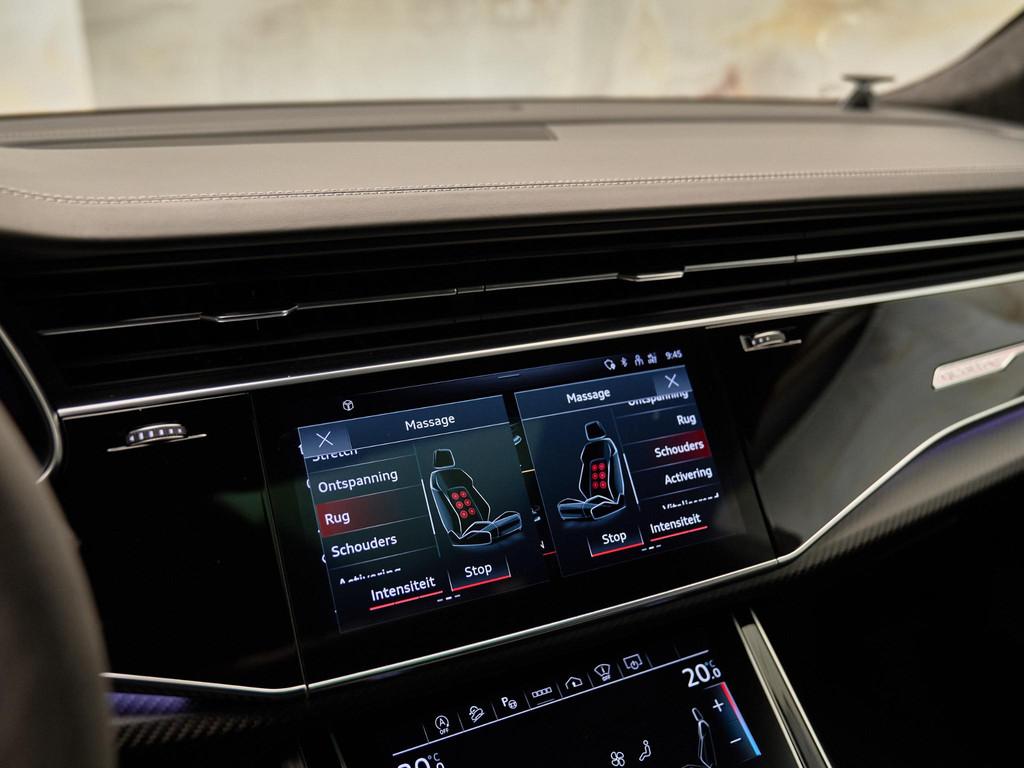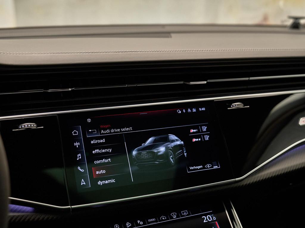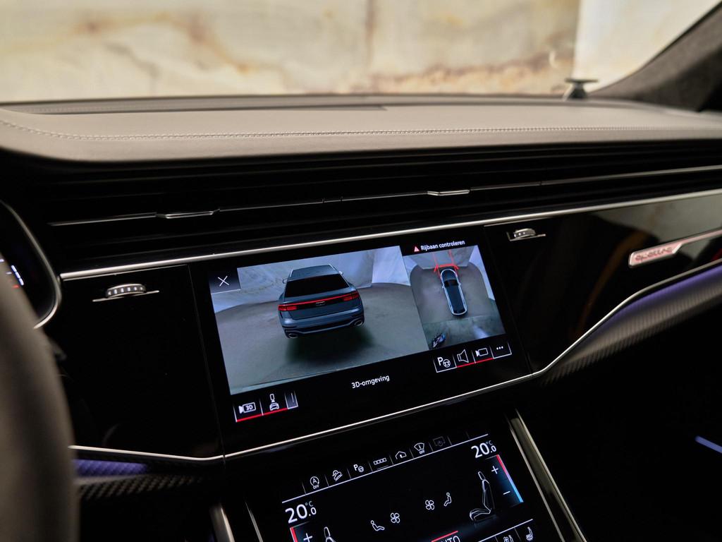 De technologische kern van deze RS Q8 wordt gevormd door het MMI navigatie plus met MMI touch response (7UG) in combinatie met de Audi virtual cockpit plus (7J3) en het indrukwekkende Bang & Olufsen Advanced 3D Sound System (8RF). Met de Head-up display (KS1) blijven alle belangrijke rijgegevens in uw gezichtsveld. Dankzij Audi smartphone interface (IU1), Audi phone box met draadloos opladen (9ZE) en Audi connect diensten (3 jaar) (IT3) bent u altijd verbonden met de wereld om u heen. Het systeem ondersteunt realtime verkeersinformatie, online media, Google Earth-weergave en spraakbediening voor een intuïtieve, digitale rijervaring.