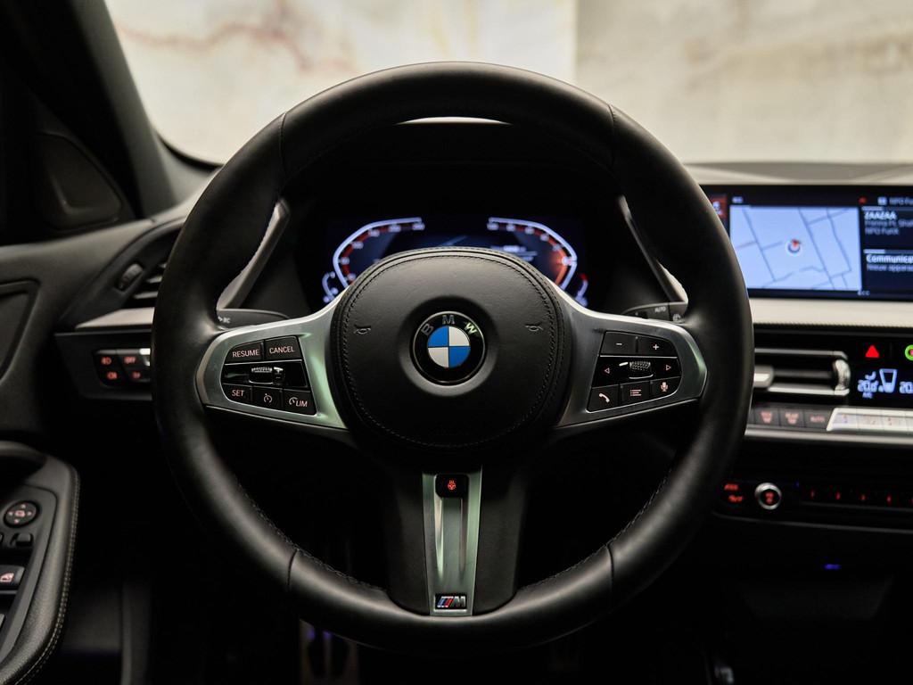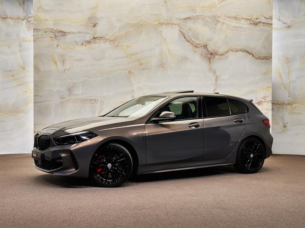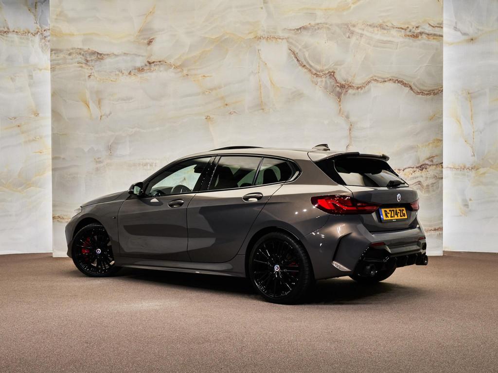 Deze 118i is uitgevoerd als Modell M Sport (P7LFA) met het M Sportpakket Pro (P33BA), M Sportonderstel (S704A), M Sportremsysteem in rood hoogglans (S3M2A), M Aerodynamicapakket (S715A), M achterspoiler (S754A), M sportstuurinrichting (S2VEA), M koplampen Shadow Line (S3MFA), BMW M Heritage logo’s (S3MQA) en de BMW LM-velgen M dubbele spaak 552M Jetblack (S1RRA). De M Hoogglans Shadow Line (S760A) en de M Hoogglans Shadow Line met uitgebreide omvang (S7M9A) ronden het sportieve uiterlijk af.