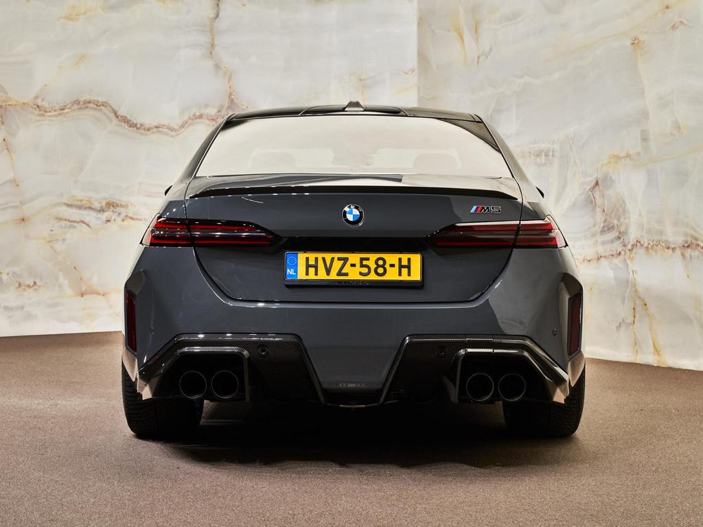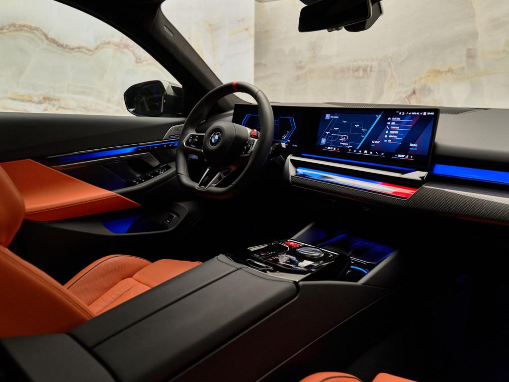 Dit betreft een zeer luxe en exclusief uitgevoerde BMW M5 Limousine V8 M Hybrid (729 pk). Kleur exterieur: Grigio Telesto Pearl Effect Metallic "Sonderlackierung" (S490A) en interieur: BMW Individual leder 'Merino' Kyalami Orange / Schwarz (LKKX). Deze auto is nieuw in Nederland geleverd, afkomstig van de eerste eigenaar en heeft slechts 8.022 km gereden. Is volledig dealeronderhouden en uiteraard is alle documentatie aanwezig. Voorzien van vele opties zoals: