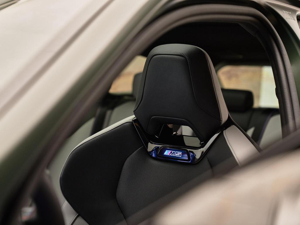 Deze M5 Touring onderscheidt zich door de BMW M spiegelkappen in carbon (S3MEA), M veiligheidsgordels (S4GQA), het BMW Iconic Glow exterieurpakket (S3DPA) en de M hoogglans Shadow Line (S760A). Samen met de 20"/21" lichtmetalen M wielen Dubbelspaak 951 M (S1GBA) en het M Compound-remsysteem in Schwarz (S3M6A) heeft de auto een uitgesproken sportieve uitstraling.
