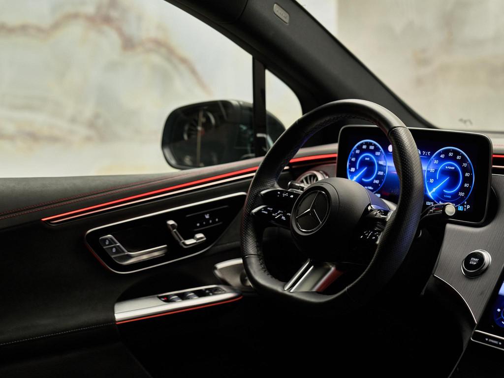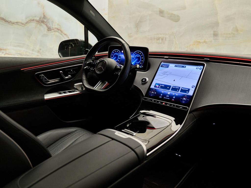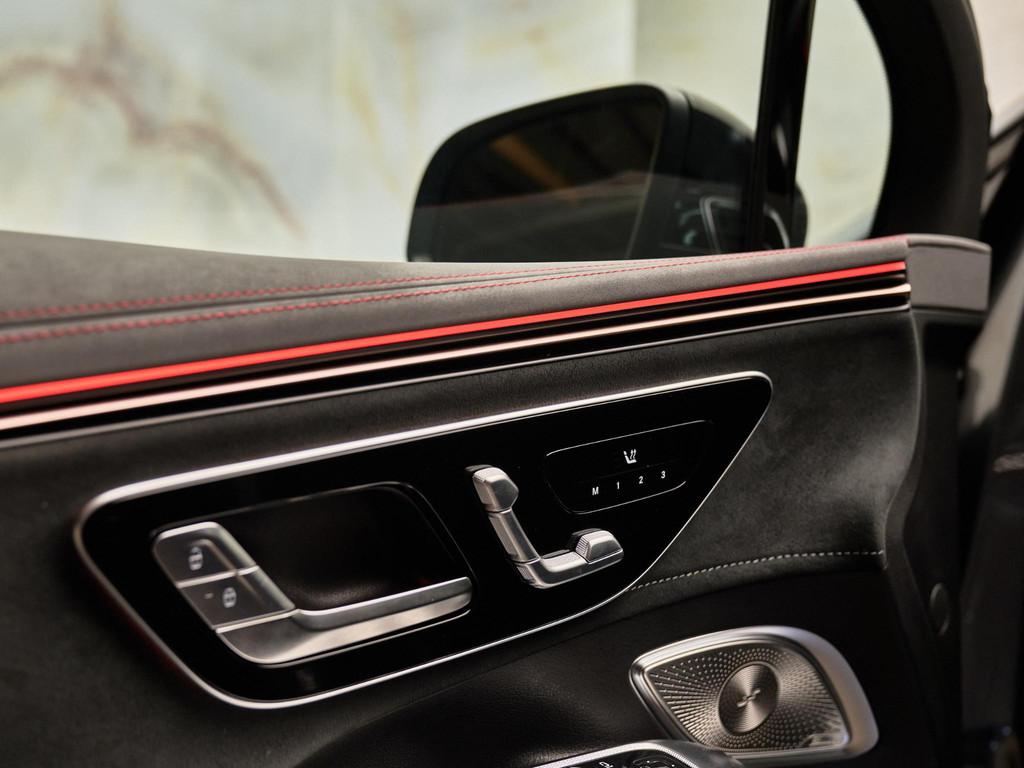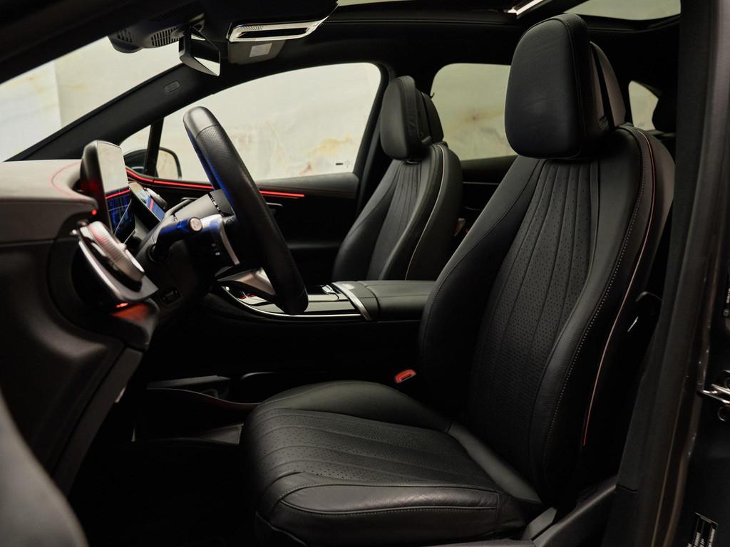 De combinatie van AMG Line exterieur (P31), AMG Line interieur (P29), AMG-styling (772) en het Nightpakket (P55) geeft deze EQE een krachtige en sportieve uitstraling. Het interieur is verfijnd afgewerkt met sierelementen in antraciet lindehout (H08), AMG-vloermatten (U26), verlichte instaplijsten (U25) en premium sfeerverlichting (891). Het Panoramisch schuifdak (413) versterkt het ruimtelijke gevoel.