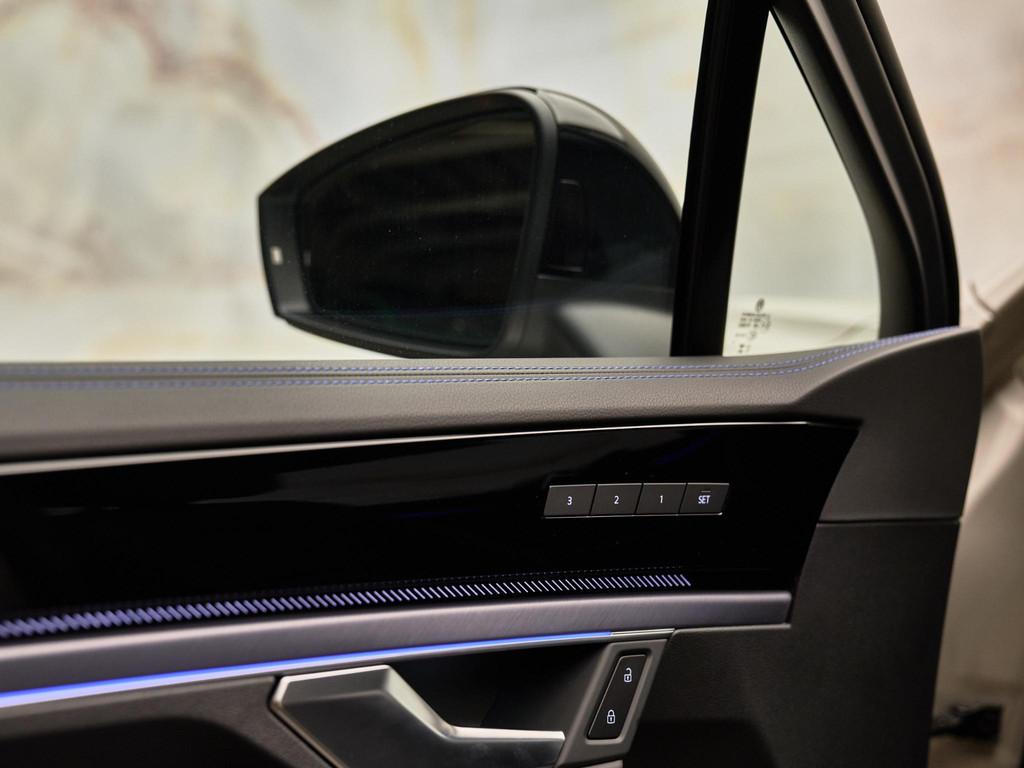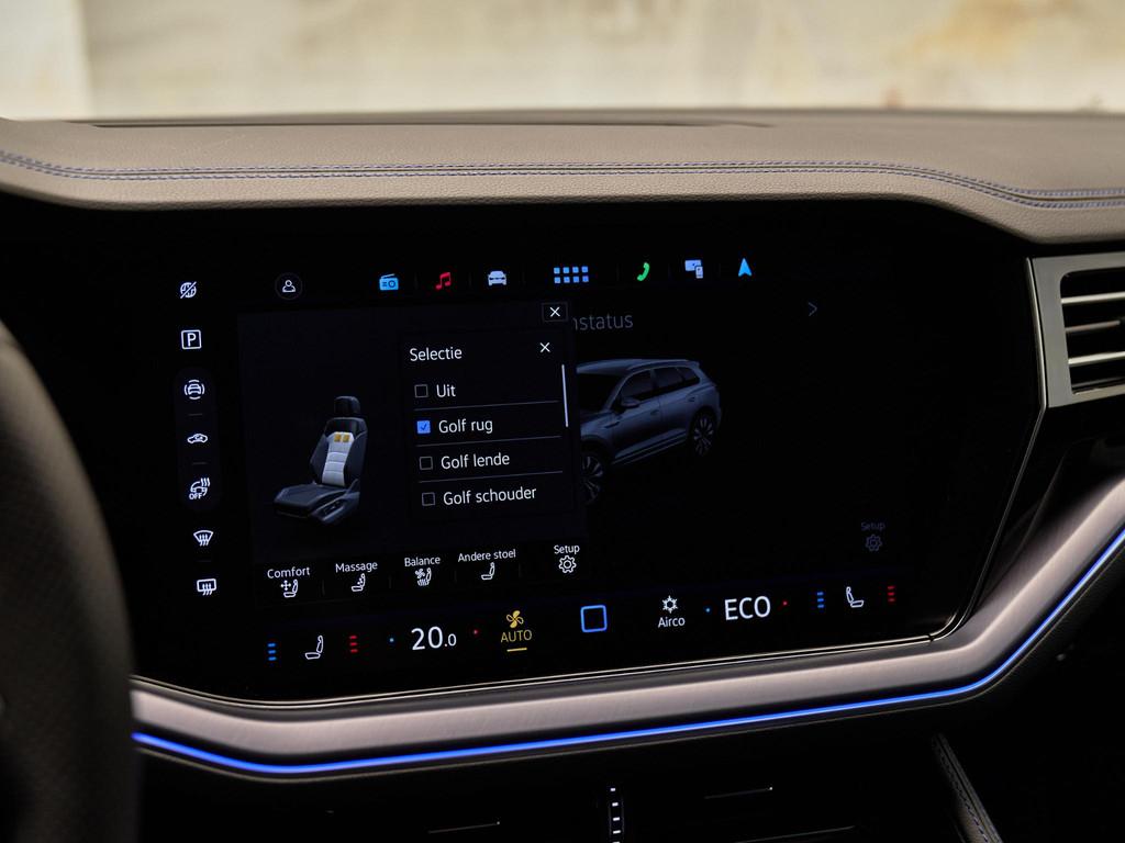 Deze Touareg biedt topcomfort met ErgoComfort-stoelen (Q2J), stoelventilatie en massagefunctie voor (4D5), stoelverwarming voor en achter (4A4), geheugenfunctie voor stoelen en spiegels (WB2/6XL), elektrisch verstelbare buitenspiegels met verwarming, dimfunctie en inklapmogelijkheid (6XL), verwarmd lederen multifunctioneel stuurwiel (2PT), elektrisch bedienbare achterklep met sensorgestuurde opening (5I6) en panoramisch schuif-/kanteldak (3FU).Ook aanwezig: elektrisch uitklapbare trekhaak met Trailer Assist (1D9), akoestisch glas (3W5), zonneschermen achter (3Y4), en omkeerbare kofferbakmat (6SJ).