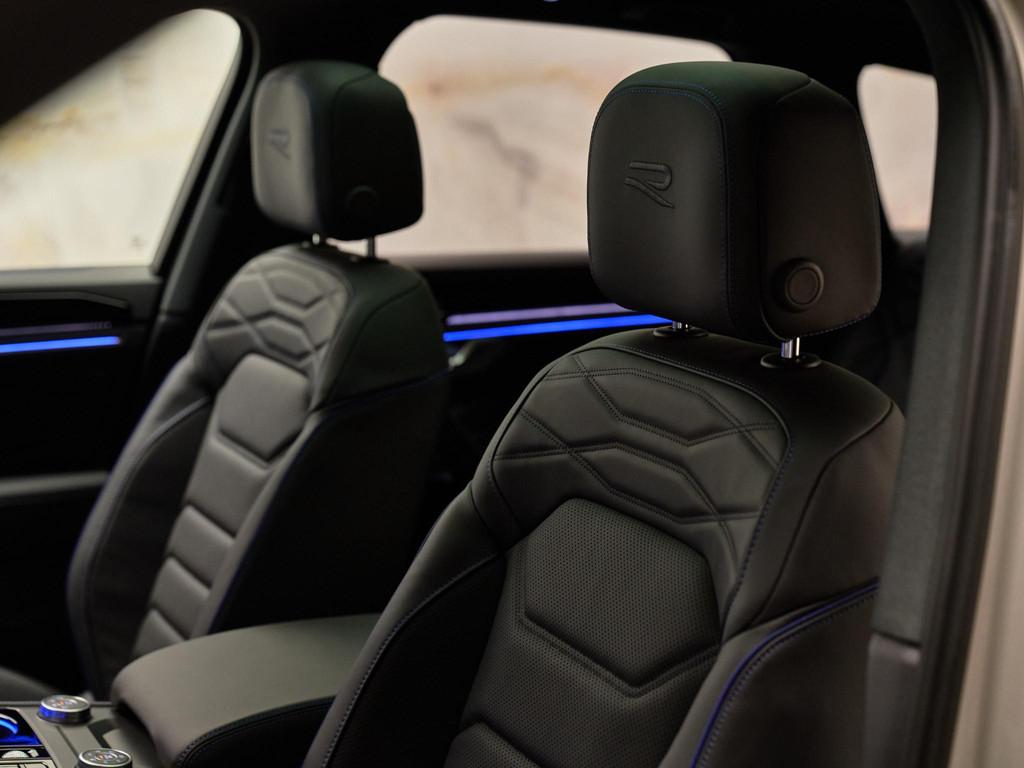 De Touareg is uitgevoerd met 22 inch lichtmetalen velgen 'Estoril' in zwart (PJ7/C8E), bandenmaat 285/35 R22 (I27), verlichte aluminium instaplijsten (VT3), zwarte spiegelbehuizing (6FJ), donker getinte zijruiten achter en achterruit (4KF), zwarte dakreling (3S7) en zwarte sierlijsten (R-uitvoering).