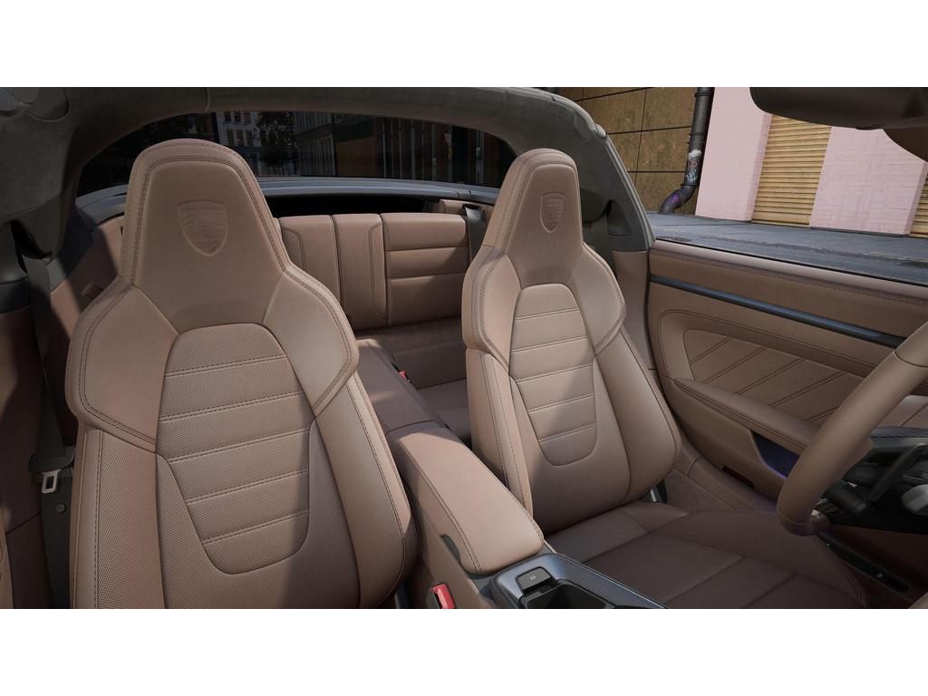 Het luxueuze Club leder interieur Truffelbruin wordt versterkt door het uitgebreide lederpakket 930 (3HB), lederen dashboardbekleding (5HB), lederen zonnekleppen (5XH) en zelfs lederen bekerhouderbekleding (ALB). De adaptieve sportstoelen Plus (Q1J) bieden maximale ondersteuning en comfort, inclusief geheugenfunctie en stoelventilatie vóór (4D3). De ambiance wordt verder verhoogd door het interieurpakket carbon mat (5MH), verlichte carbon dorpellijsten (7M8) en subtiele sportieve details zoals het Porsche-embleem op de hoofdsteunen (3J7).