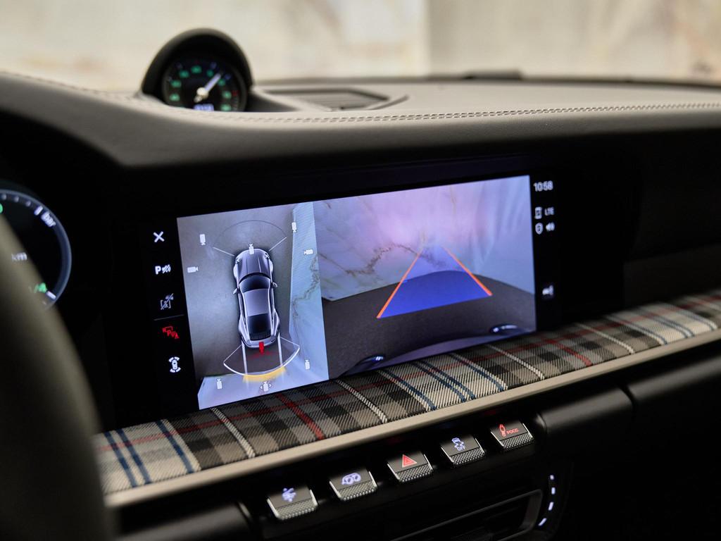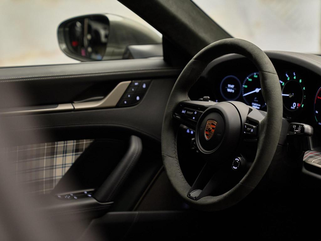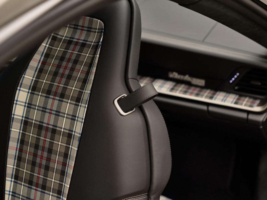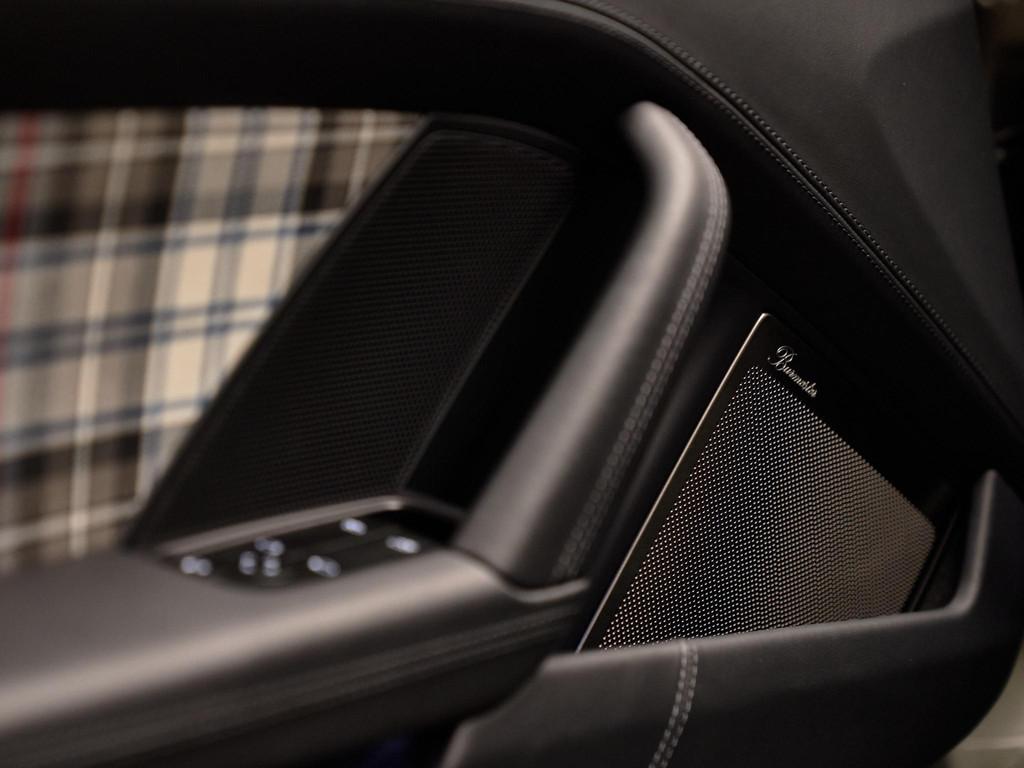 Het interieur in zwart leder met Tartan-accenten ademt nostalgie, terwijl moderne luxe aanwezig is in de vorm van het verwarmde GT-sportstuur in Race-Tex (2ZF) en het hoogwaardige Burmester® High-End Surround Sound System (9VJ) voor een ongeëvenaarde geluidsbeleving.