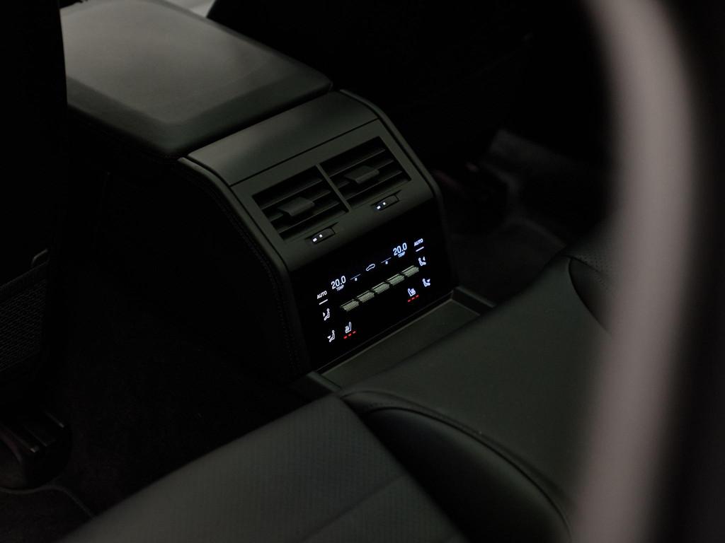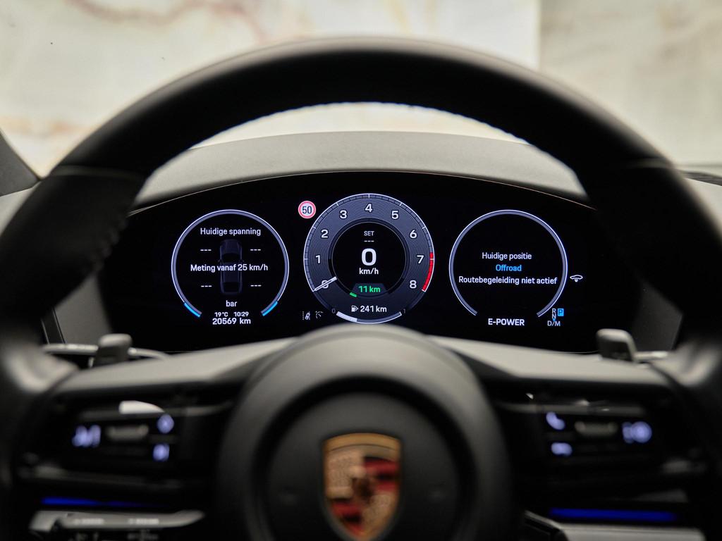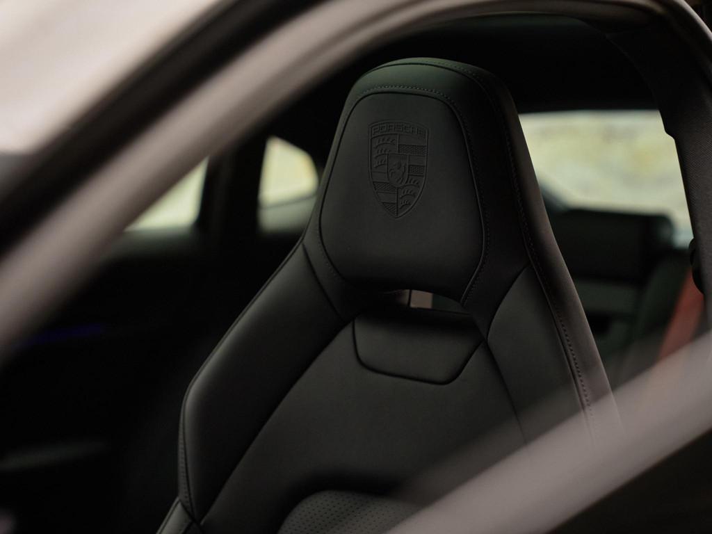 Binnenin heerst rust en luxe dankzij de 4-zone automatische airconditioning (9AH) en het panoramadak (3FU). De Comfortstoelen 14-voudig elektrisch met memory (Q2J) zorgen voor perfecte ondersteuning; stoelverwarming achter (4A4) verhoogt het comfort voor alle inzittenden. Het interieur is uitgevoerd in zwart, glad leder, verfraaid met het interieurpakket geborsteld aluminium zwart (5TH) en Porsche emblemen in de hoofdsteunen (5ZF). De gordels in bordeauxrood (FI6) geven een subtiel sportief accent, en dankzij de 4+1-stoelen configuratie (5KA) is er plaats voor vijf. Vaste bagageruimte-afdekking (3U7) en verplicht verbandtrommel (1T3) zijn praktisch en netjes geïntegreerd.